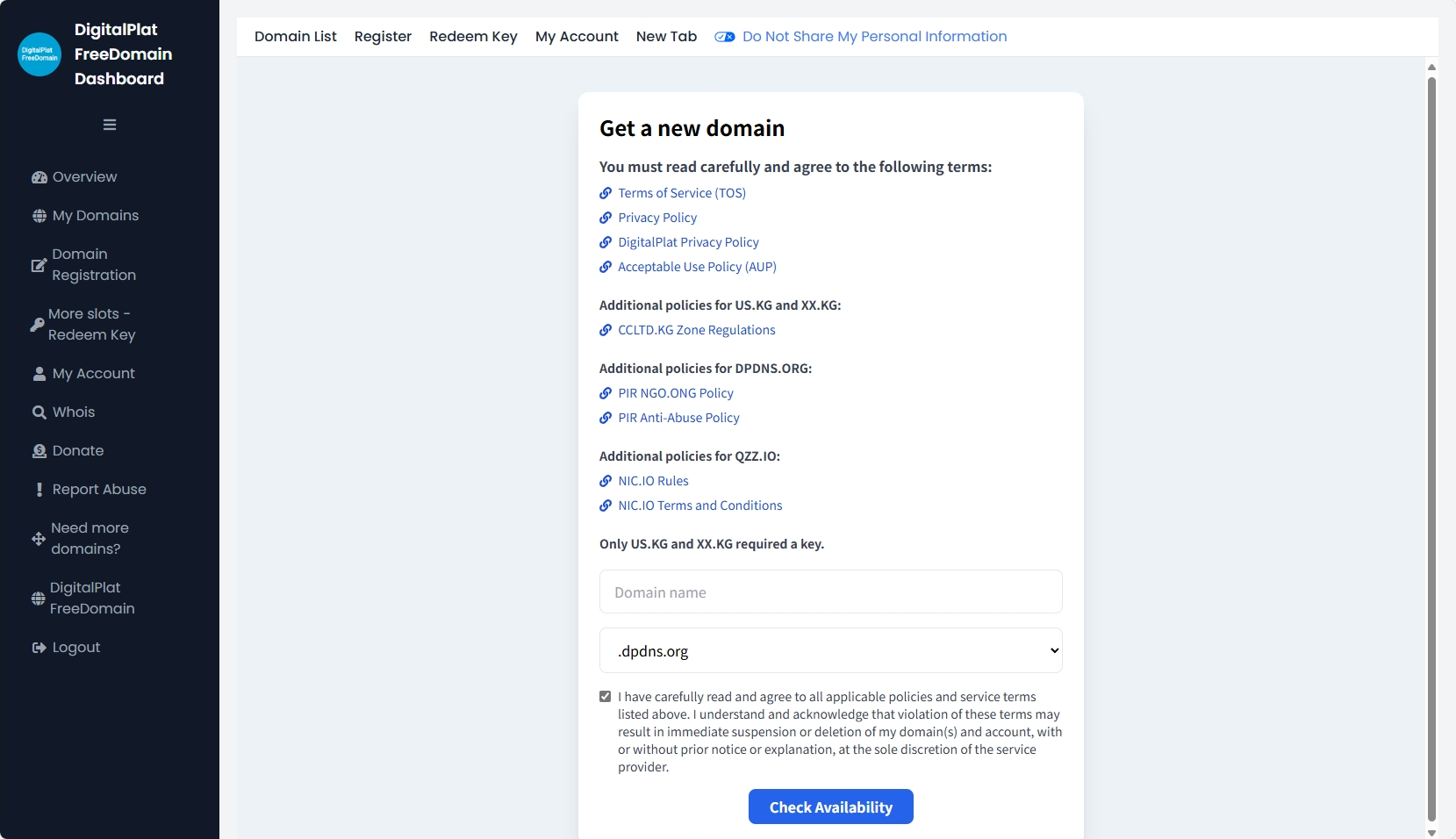 点击左边的Domain Registration,输入你想要的域名,选择一个你喜欢的后缀(dpdns.org和qzz.io免费)