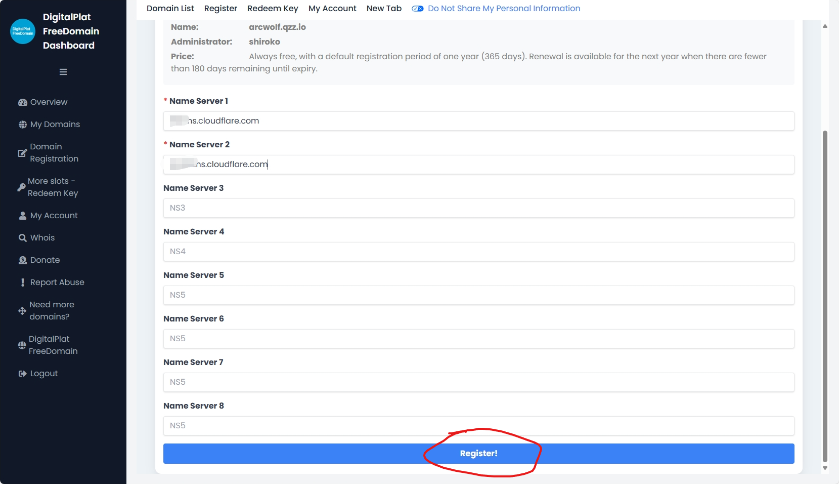 填好之后,往下翻,点击圈出来的那个按钮,这样域名就注册好了。
