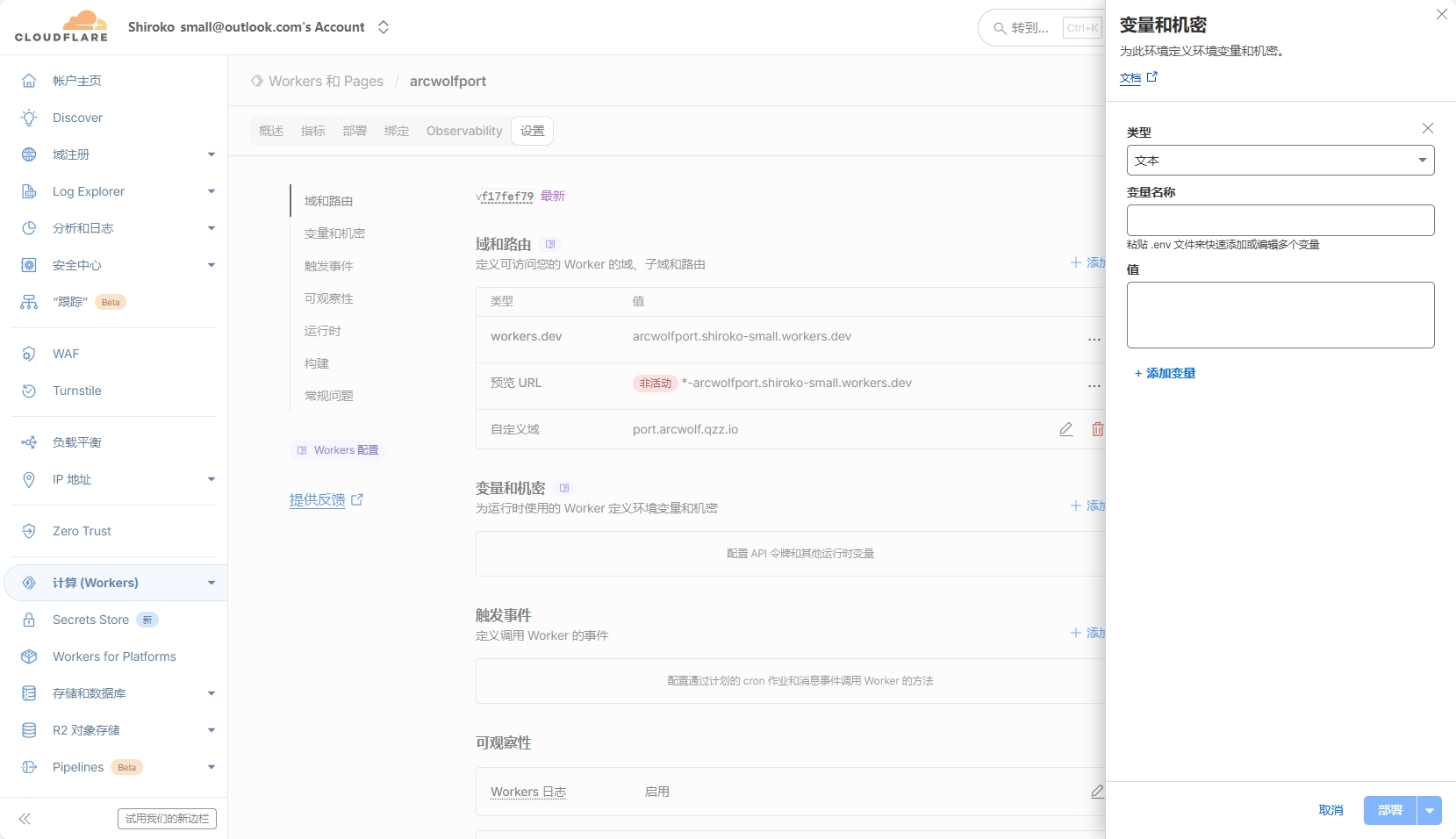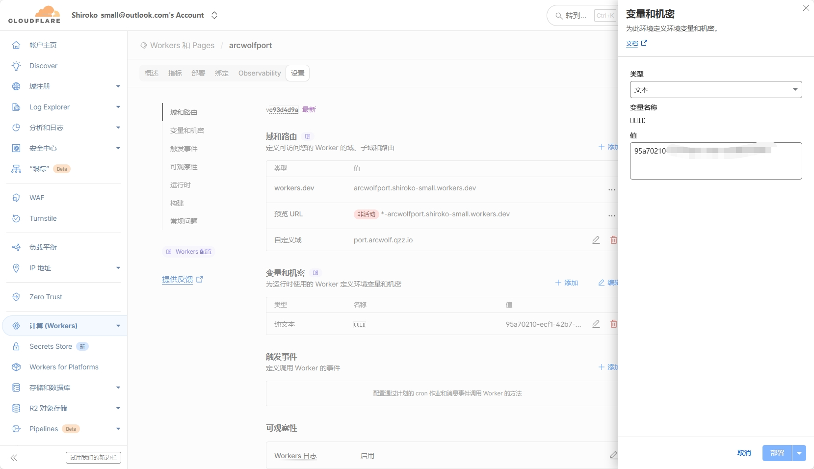 回到workers设置,点击变量和机密旁边的加号,添加一下UUID