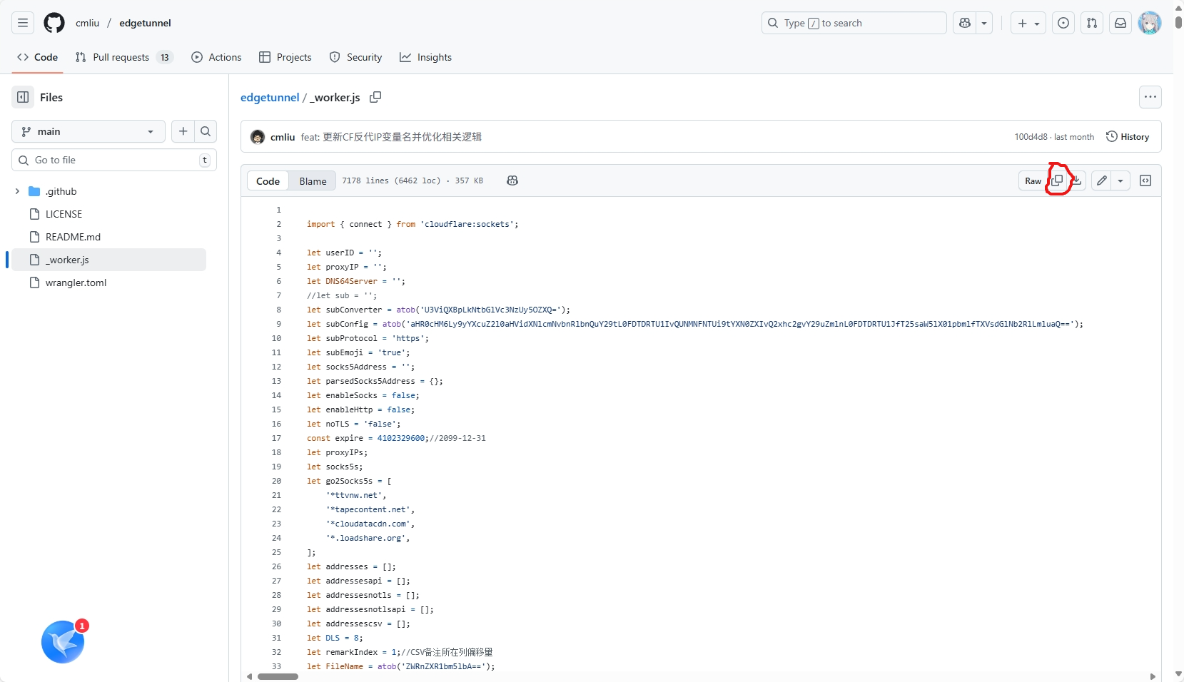 新建一个标签页,打开这个链接edgetunnel/_worker.js at main · cmliu/edgetunnel,点击圈出来的那个按钮,复制里面的代码