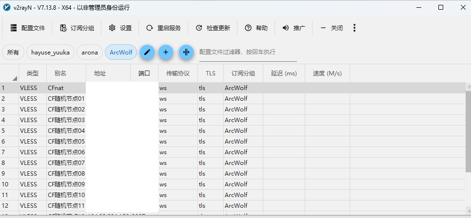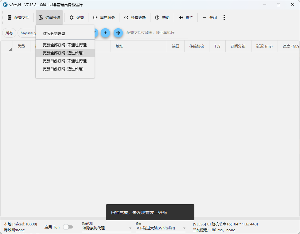 点击订阅分组,找到更新当前订阅(不通过代理),获取节点。